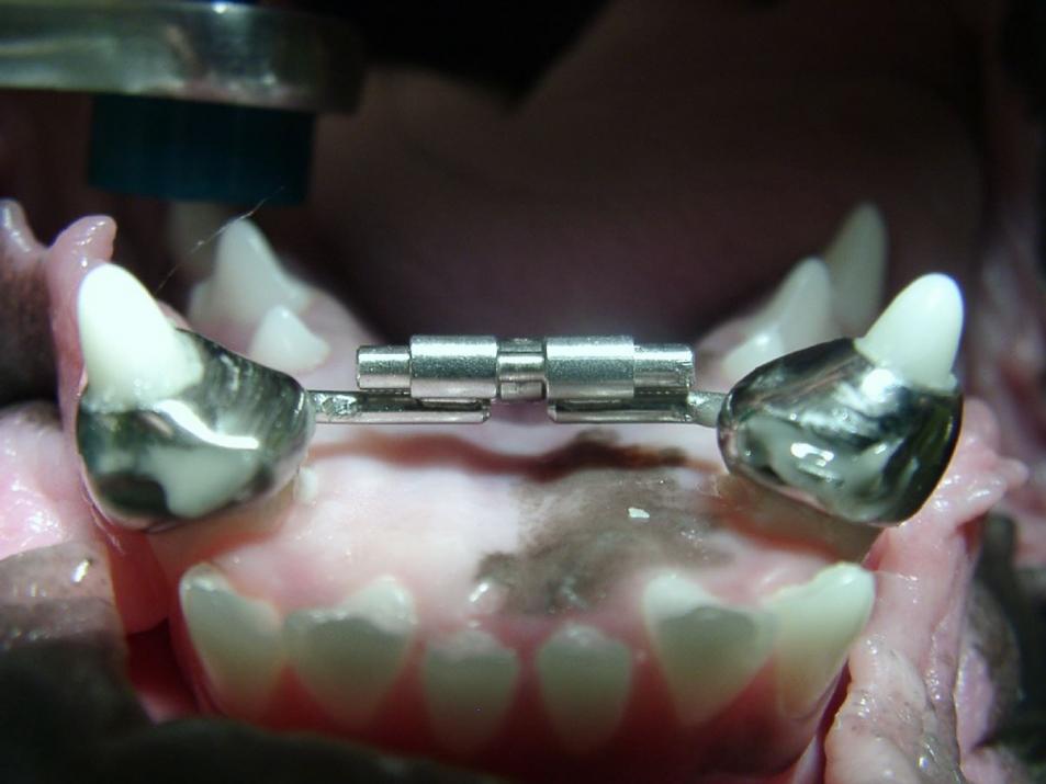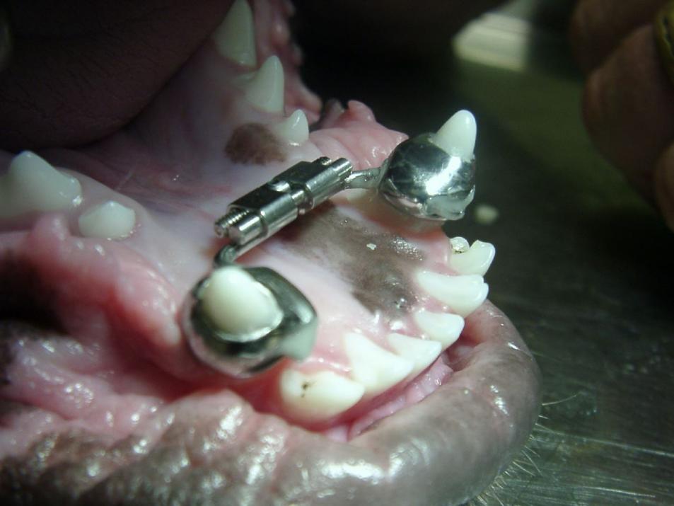 Kieferorthopädische Maßnahmen sind manchmal auch bei Hund oder Katze notwendig. Vor allem bei angeborenen, aber auch bei unfallbedingten Zahnfehlstellungen muss regulierend eingegriffen werden. In Zusammenarbeit mit unserem Zahntechniker können wir dabei Zahnspangen, Gleitschienen und weiteres Kiefer- und Zahnregulierendes anfertigen.